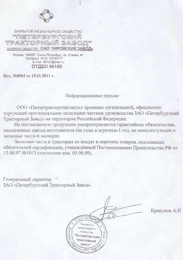 Мы профессионально занимаемся ремонтом и обслуживанием узлов и тракторов «Кировец». Данный вид деятельности полностью сертифицирован нашим предприятием, на все произведенные работы действует гарантия 6 месяцев.